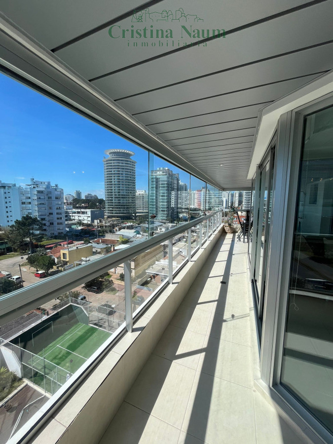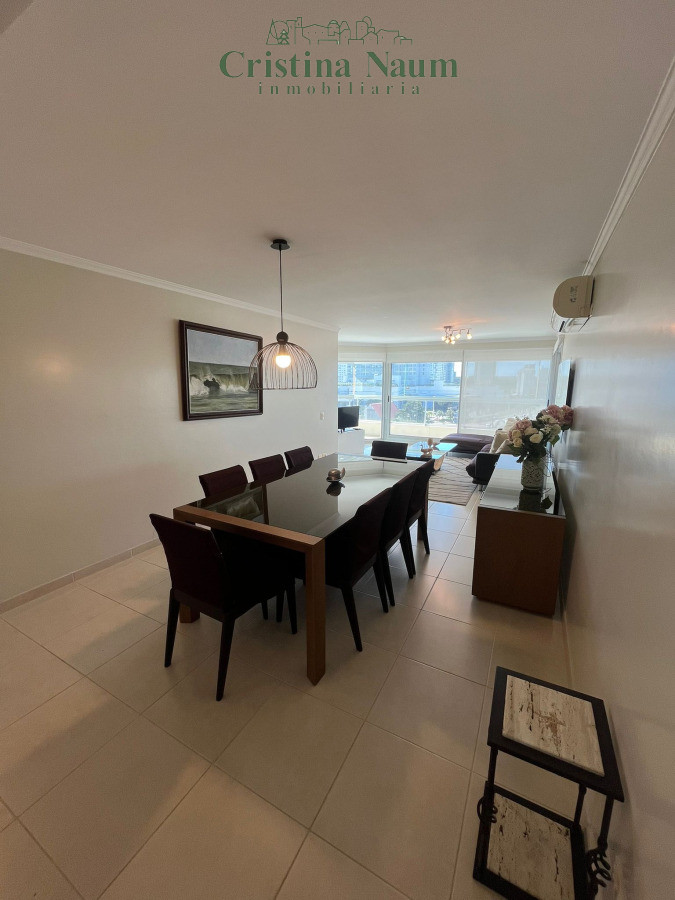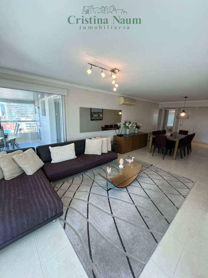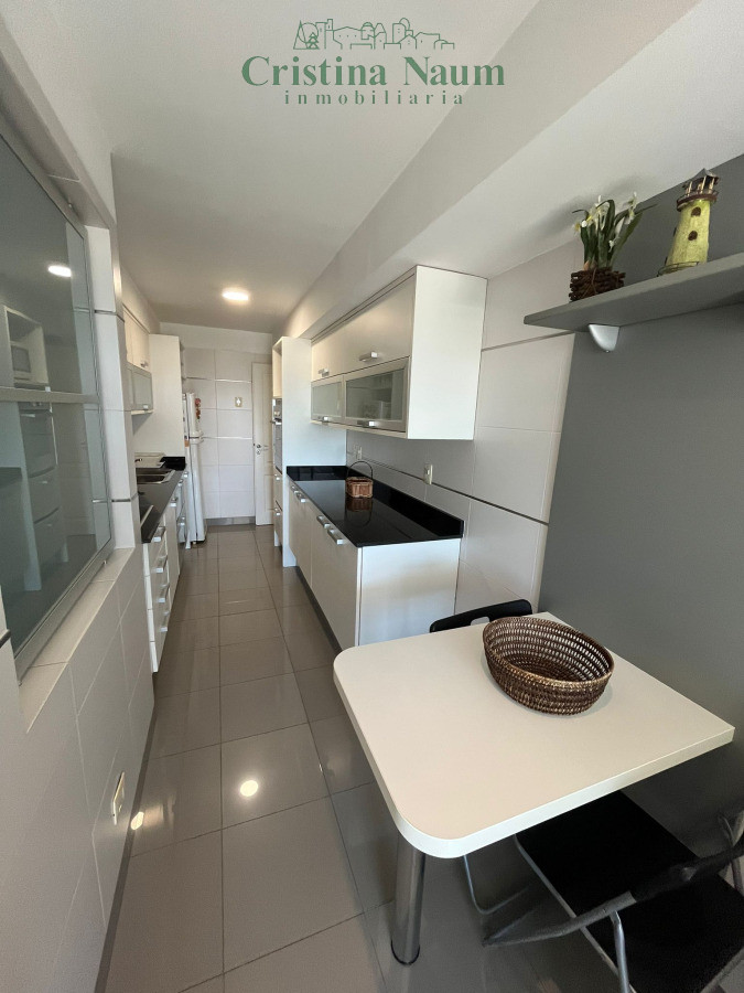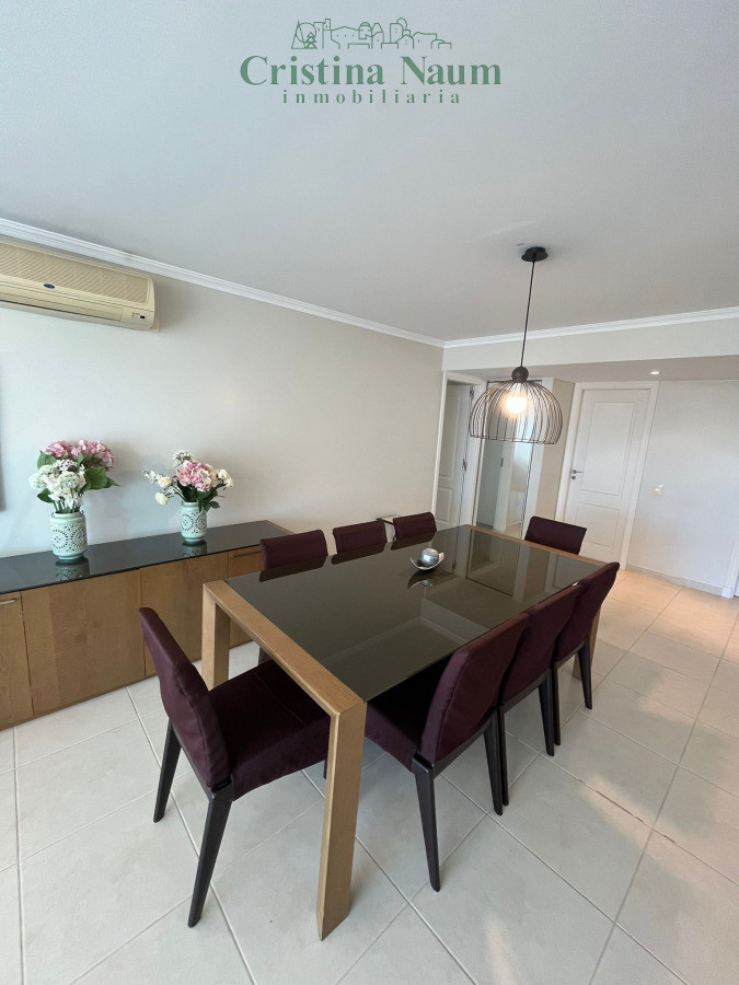 Amplio apartamento con living comedor con terraza vidriada que puede abrirse con parrillero propio y vista al mar (108m2), 3 dormitorios, uno en suite, toilette, cocina con lavadero que conecta con la dependencia de servicio. Garage para un auto. Aire acondicionado en todos los ambientes, losa radiante en los baños.
