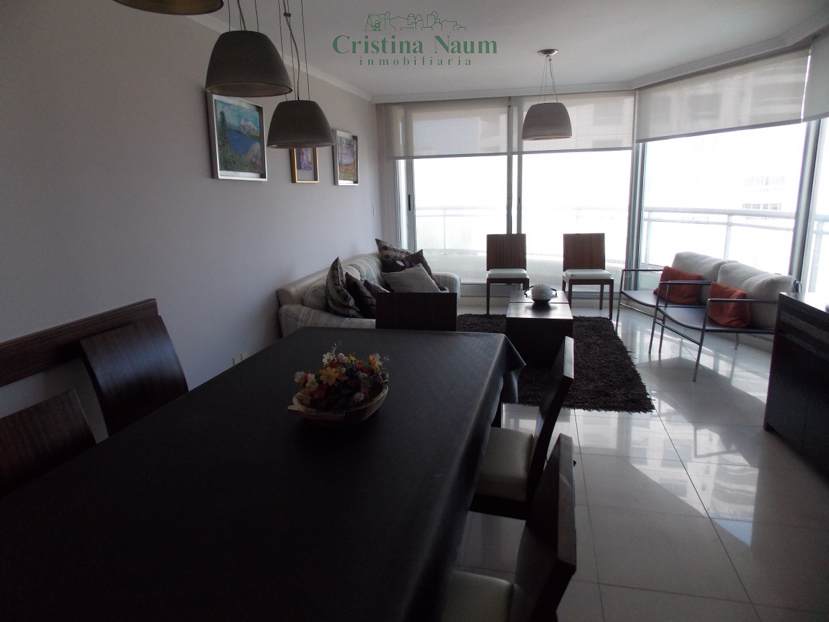 Apartamento con 3 dormitorios en suite (ventiladores de techo), 3 baños, living-comedor y cocina.
