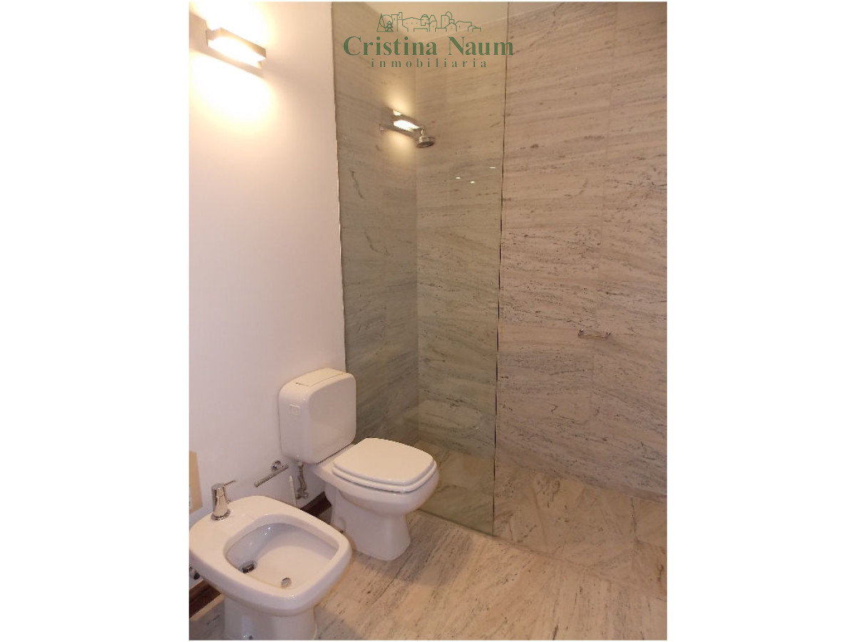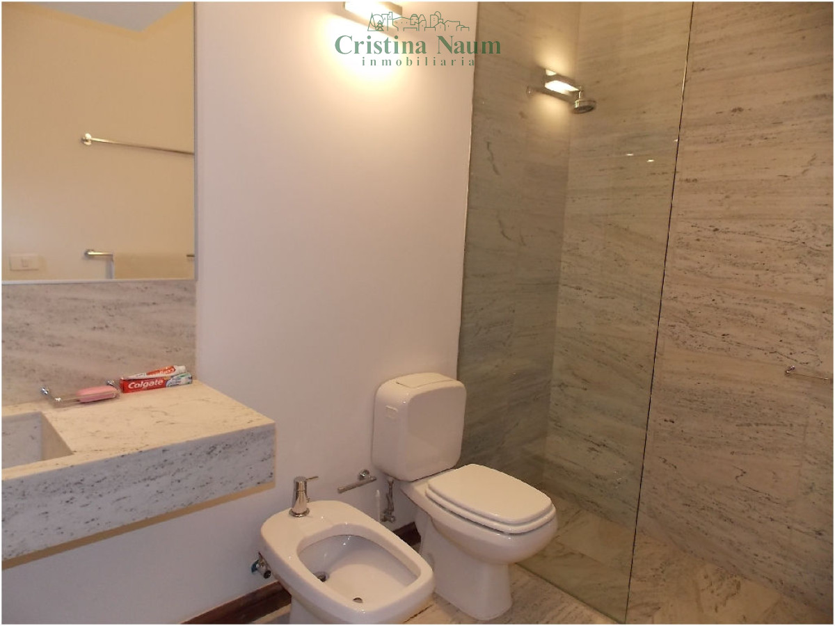 3 dormitorios (1 en suite), 2 baños, living-comedor, kitchenette y 2 garajes.