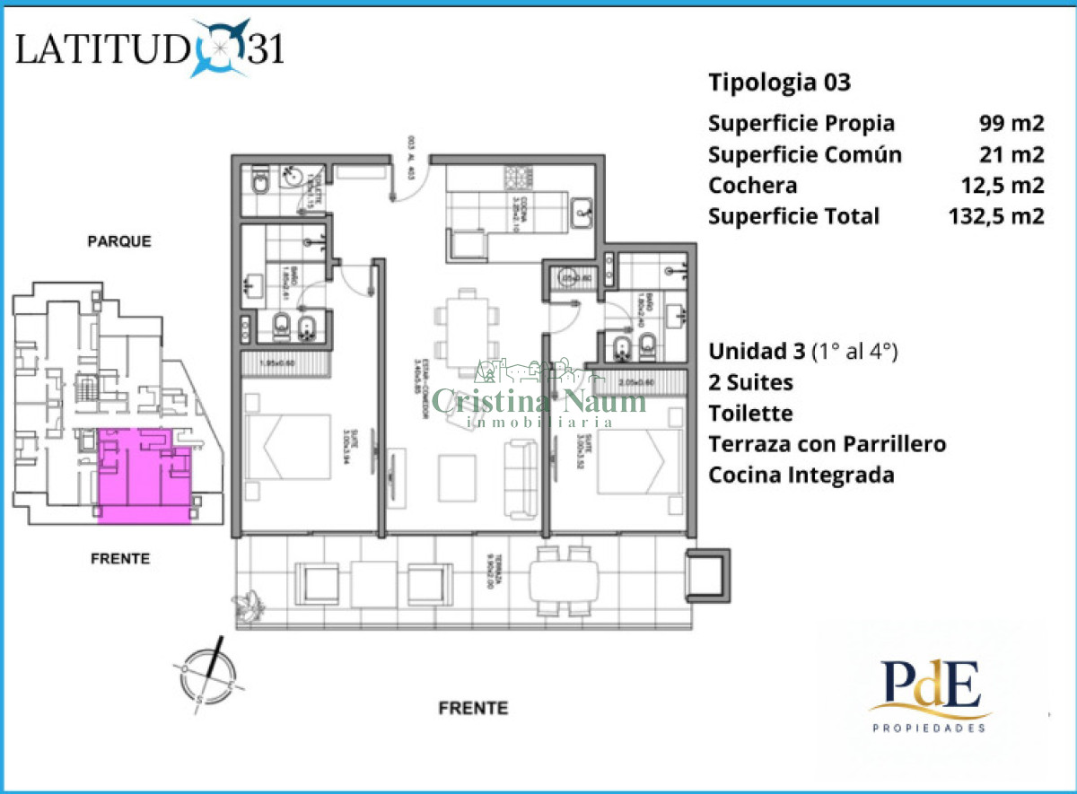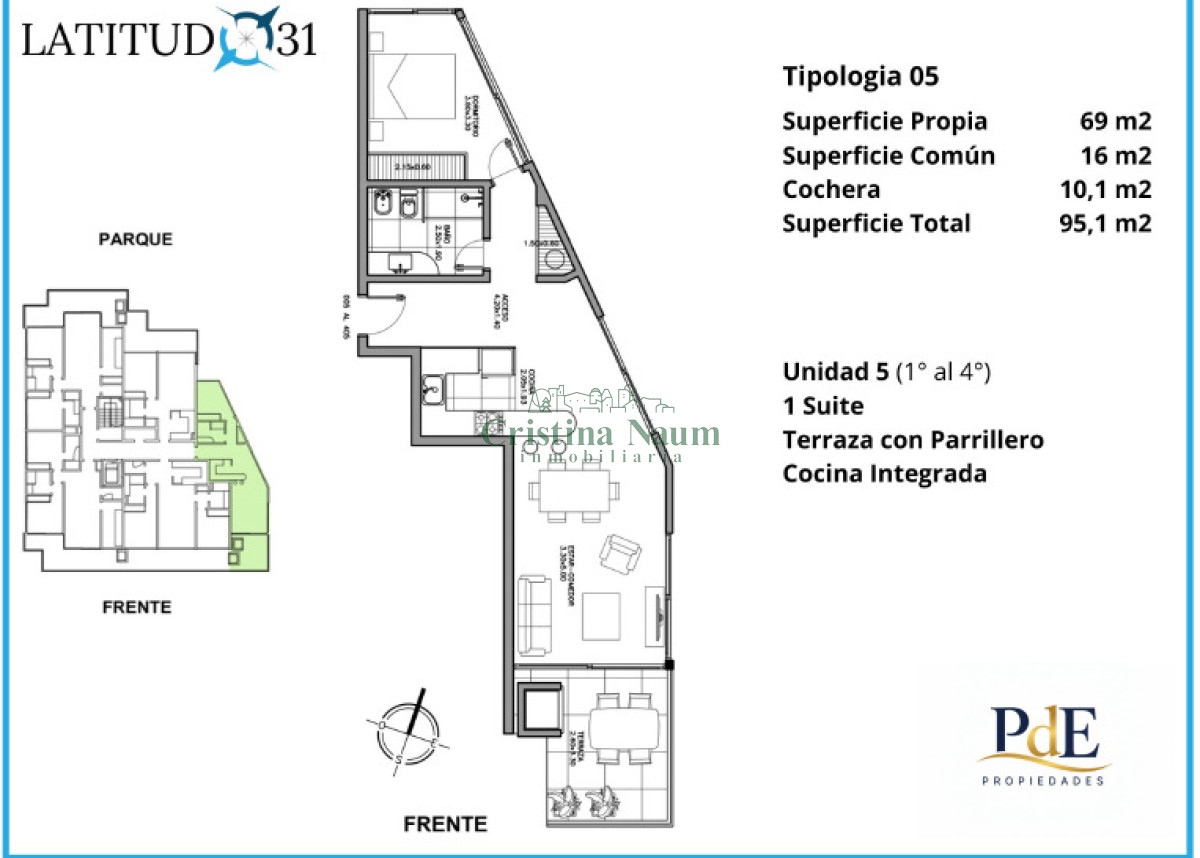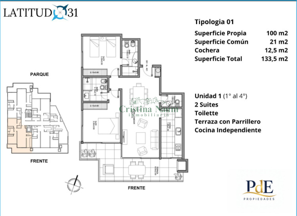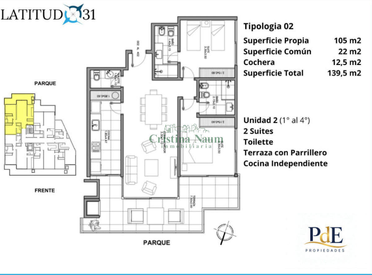 Ubicado en la parada 31 de Playa Brava en Punta del Este, Latitud 31 te invita a descubrir la sofisticación en cada una de sus 25 exclusivas unidades. Características destacadas: Amplios departamentos de 1 y 2 dormitorios. Impresionantes terrazas con parrilleros propios para disfrutar de inolvidables momentos de relax. Una piscina climatizada exterior para grandes y otra para chicos, en un entorno ideal. Sala de juegos para momentos de diversión y entretenimiento. Barbacoa de uso general para compartir con familia y amigos. Gimnasio con un retiro verde, un espacio exterior natural para practicar yoga o meditación. Cancha de paddel Sauna seco Tipologia 01: 100m2 propios /133.5 total 2 suites,toilette ,tza c/parrillero propio,gge desde usd 399.300 (101) Tipologia 02: 105m2 propios/139.5 total 2 suites, toilette, tza c/parrillero propio, gge desde usd 416.900 (102) Tipologia 03: 99m2 propios /132,5 total 2 suites ,toilette, tza c/parrillero propio, gge desde usd 405.900 (103) Tipologia 04: 70m2 propios/ 98,5 total 1 suite cocina integrada, tza c/parrillero propio,gge desde usd 297.000 (104) Tipologia 05: 69m2 propios/95,10 total 1 suite,cocina integrada, tza c/parrillero propio,gge desde usd 276.100 (105) Gastos comunes aprox los de 2 dormitorios usd 300 x mes ENTREGA APROXIMADA : DICIEMBRE 2027 FORMA DE PAGO: 10% SEÑA 20% A LA FIRMA DEL COMPROMISO 60% EN 24 CUOTAS MENSUALES 10% A LA OCUPACION REGLAMENTO -PLANOS 5% COMISION INMOBILIARIA 4% IVA INCLUIDO